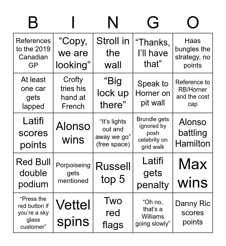 This bingo card has a free space and 43 words: “Around the outside”, Danny Ric scores points, “Hug it like your favourite granny”, “Press the red button if you’re a sky glass customer”, “Fernando Alonso leads ahead of Max Verstappen”, “Oh no, that’s a Williams going slowly”, Stroll in the wall, Both Canadians are out of the Canadian GP, Haas bungles the strategy, no points, Vettel spins, “Thanks, I’ll have that”, Brundle gets ignored by posh celebrity on grid walk, Russell top 5, Porpoiseing gets mentioned, Camera s🅱️in effect during pit stop, Two red flags, Ferrari engine troubles, Latifi scores points, Ferrari bungles pit stop/strategy, Reference to RB/Horner and the cost cap, “Copy, we are looking”, “Bono”, Brundle explains what DRS is, References to the 2019 Canadian GP, Winning delta is +10s, Alonso battling Hamilton, Canadian stereotype, Groundhog runs on track, Latifi gets penalty, Red Bull double podium, Ferrari double podium, Max wins, Sainz wins, Alonso wins, +5s pit stop, VSC comes out, Canadian anthem +1:15s, “Big lock up there”, At least one car gets lapped, Speak to Horner on pit wall, Team orders!, Crofty tries his hand at French and MSC scores points.