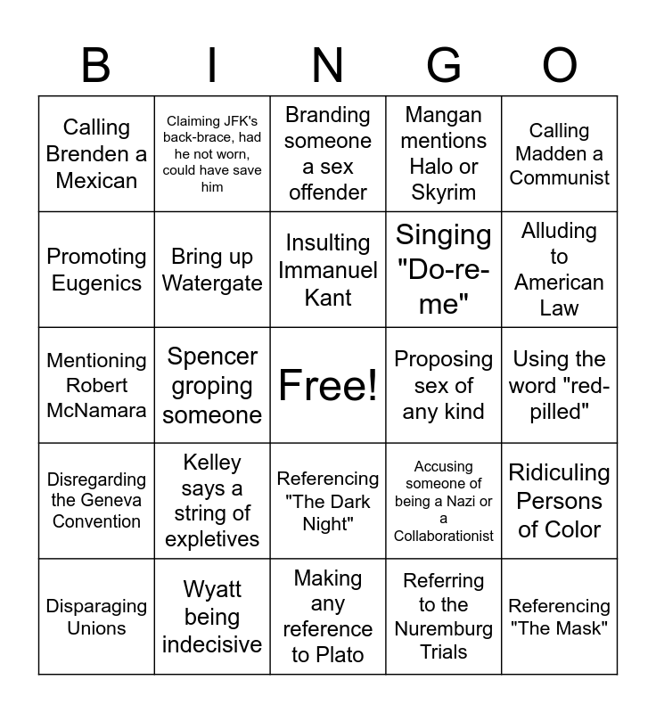 This bingo card has a free space and 24 words: Kelley says a string of expletives, Wyatt being indecisive, Insulting Immanuel Kant, Disparaging Unions, Calling Madden a Communist, Calling Brenden a Mexican, Promoting Eugenics, Claiming JFK's back-brace, had he not worn, could have save him, Proposing sex of any kind, Referencing "The Dark Night", Singing "Do-re-me", Mentioning Robert McNamara, Accusing someone of being a Nazi or a Collaborationist, Ridiculing Persons of Color, Bring up Watergate, Referring to the Nuremburg Trials, Using the word "red-pilled", Branding someone a sex offender, Alluding to American Law, Spencer groping someone, Referencing "The Mask", Disregarding the Geneva Convention, Mangan mentions Halo or Skyrim and Making any reference to Plato.