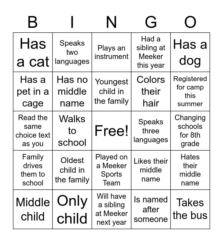 This bingo card has a free space and 24 words: Oldest child in the family, Only child, Youngest child in the family, Middle child, Has a dog, Has a cat, Has a pet in a cage, Speaks two languages, Speaks three languages, Played on a Meeker Sports Team, Colors their hair, Read the same choice text as you, Likes their middle name, Hates their middle name, Has no middle name, Is named after someone, Changing schools for 8th grade, Plays an instrument, Registered for camp this summer, Walks to school, Takes the bus, Family drives them to school, Had a sibling at Meeker this year and Will have a sibling at Meeker next year.