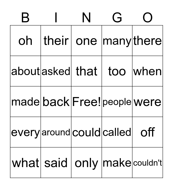 This bingo card has a free space and 24 words: around, said, that, what, there, oh, about, their, people, could, too, made, called, off, asked, make, were, one, when, back, couldn't, every, many and only.