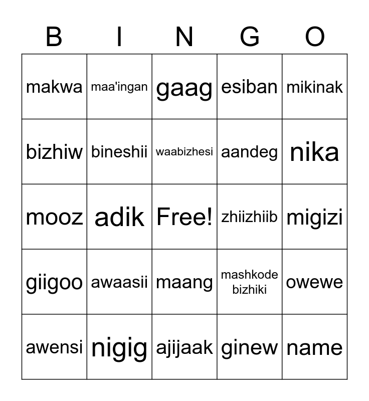 This bingo card has a free space and 29 words: awensi, waagosh, adik, wazhashk, makwa, gaag, bineshii, awaasii, zhiizhiib, nigig, migizi, name, ajijaak, ginew, nika, amik, maang, giigoo, mikinak, mooz, mashkode bizhiki, binesi, aandeg, bizhiw, esiban, maa'ingan, owewe, waabizhesi and zhedeg.
