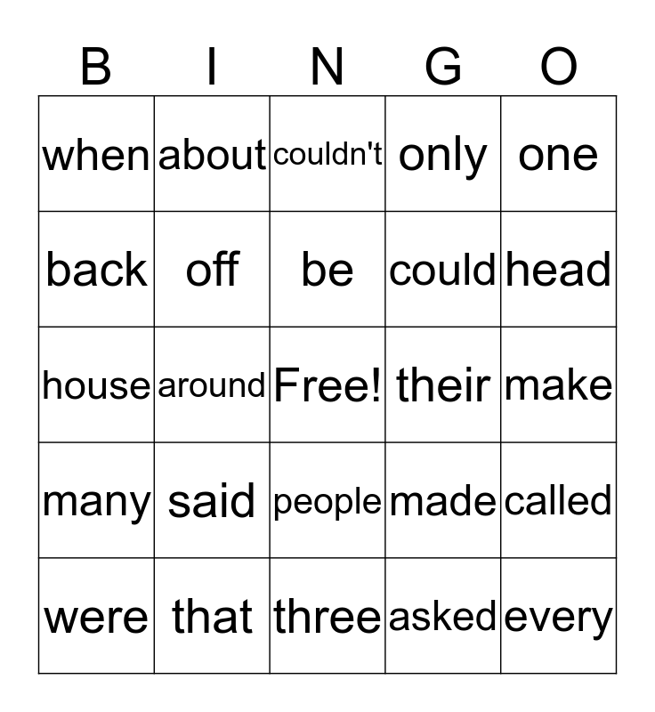 This bingo card has a free space and 24 words: said, that, be, were, one, when, back, about, their, people, could, house, made, called, off, asked, make, couldn't, head, around, every, many, only and three.