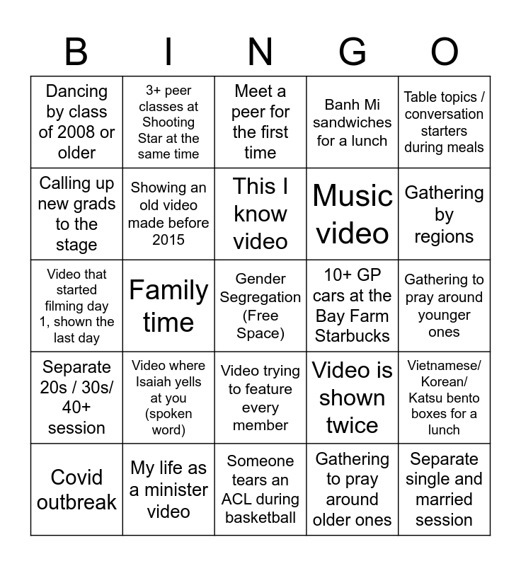 This bingo card has a free space and 24 words: Video where Isaiah yells at you (spoken word), My life as a minister video, This I know video, Covid outbreak, Table topics / conversation starters during meals, Dancing by class of 2008 or older, Calling up new grads to the stage, 3+ peer classes at Shooting Star at the same time, 10+ GP cars at the Bay Farm Starbucks, Video trying to feature every member, Music video, Video that started filming day 1, shown the last day, Video is shown twice, Vietnamese/ Korean/ Katsu bento boxes for a lunch, Showing an old video made before 2015, Gathering to pray around older ones, Gathering to pray around younger ones, Meet a peer for the first time, Gathering by regions, Family time, Separate single and married session, Separate 20s / 30s/ 40+ session, Banh Mi sandwiches for a lunch and Someone tears an ACL during basketball.