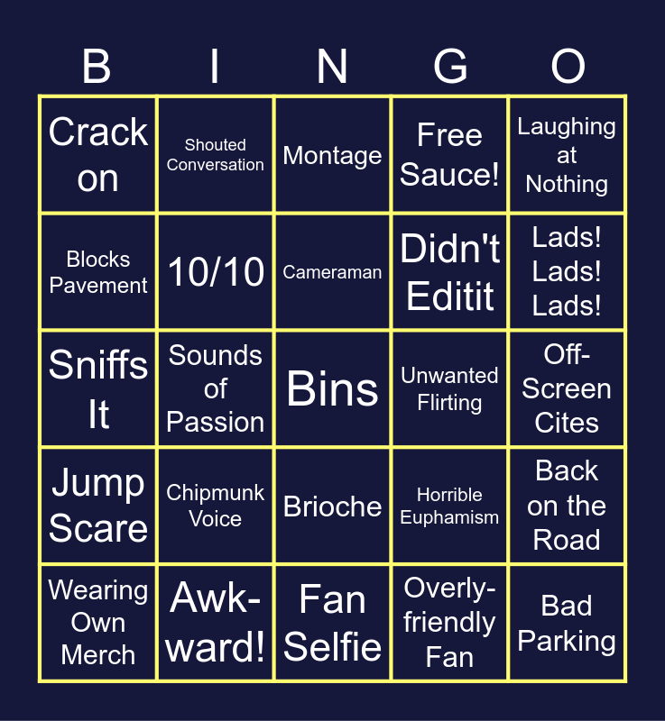 This bingo card has a free space and 51 words: Now then guys!, Bad Parking, Flavour, Fan Selfie, Chipmunk Voice, Mask Slips, Shouted Conversation, Bad Audio Mix, Blocks Pavement, Full Price, 10/10, Free Sauce!, Back on the Road, Horrible Euphamism, Sings, Knacker Cracker, Cameraman, Unwanted Flirting, BOSH, Laughing at Nothing, Sounds of Passion, Overly-friendly Fan, Crack on, Didn't Editit, Devil's Food, Too Spicy, Lads! Lads! Lads!, Waves @Car Horn, Wearing Own Merch, Montage, Cheap move, Byo-ti-ful, Food on Face, Never... Ending... Story, Main Character, Awk-ward!, Ey-up!, Crashes, Gravy!, Whistle Wetted, Off-Screen Cites, Jump Scare, Awkward Fist Bump, Woo!, Chair Test, Oh my days!, Sniffs It, Rips It Apart, Slo... Mo..., Brioche and Urchins.