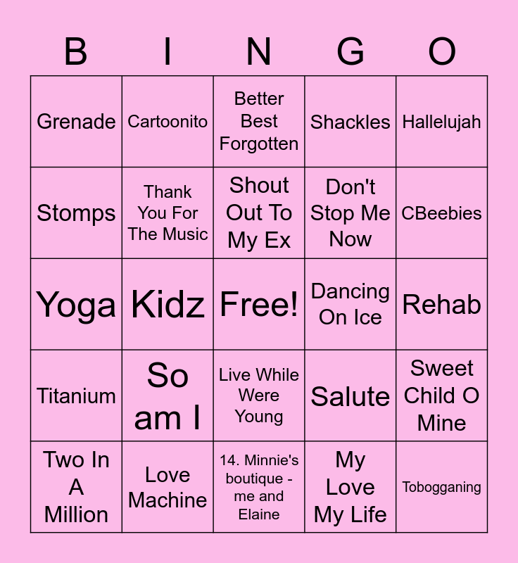 This bingo card has a free space and 401 words: PJ Masks, Midnight Memories, 16. Mousekadoer - James and Me, Tragedy, Hallelujah, Goodbye, 25. The summer dances - everyone, 59. I'm Luna girl - me and Rachel, The Climb, Muppet Babies, 44. Never land pirate band - Gio and Beckie, These Days, Heartbreak In This City, 8. Count on Us - Flo and Hannah, 9. Super singing Heroes - Rachel and David, Fozzie, Family, Sparky Come Back to Me, Money Money Money, Lucky Day, Set Fire To The Rain, Breaking Free, Amazing Machines, Year 3000, 45. Mighty Little Gekko - Dave and Amy, Kids, Footprints in the sand, CBBC, Slipping Through My Fingers, Better Best Forgotten, A Million Love Songs, Na Na Hey Hey Kiss Him Goodbye, Start up your imagination, When I Kissed The Teacher, Does Your Mother Know, Story Of My Life, Love at first sight, What I've Been Looking For, Love Ain't Gonna Wait for You, Live While Were Young, 51. Tap tap tap your feet - me and Beckie, Love Machine, Roar, Geno, Parachute, Wake Me Up, 6. Get up and dance - Me and Richie, Cha Cha Slide, Power, No More Sad Songs, 52. Pirates Island hideout - Gio and Rachel, 1. Hot Dog - James and Melissa, Penguin with A Plan, Colours, Ooh la la, Back For Good, 33. Ready for action - me and Eve, 41. KC's lullaby - me and Rachel, More Than Friends, 2 Hearts, Reggaeton Lento, Last Thing On My Mind, That's My Girl, The Chase, Friends, Chain Reaction, Dancing On Ice, Pray, Anymore, Thank You For The Music, Don't Stop Believin, Summer - me and Rachel, Relight My Fire, I Wish It Could Be Xmas, Me And My Broken Heart, I Do I Do I Do I Do I Do, Bass Face, Mamma Mia, Sound Of The Underground, Summer, Rock DJ, Piggy - Jo and me, Say You'll Be There, Kermit, CBeebies, Andante Andante, Better The Devil you Know, 60. Take over the world - Paul and me, Long Hot Summer, Titanium, Happy Now, Lush Life, Headlines, Think About Us, Loco Motion, 12. I've been there buddy - Rob and Rachel, 17, The Loving Kind, Glorious, UP, Black Magic, Night Changes, Rehab, Airplanes, Greatest Day, Our Last Summer, I Think Were Alone Now, 39. Letters - me and Andy, Unpredictable, Music, Dynamite, Tears On My Pillow, No More Tears Enough, Stomp, You Are Not Alone, Hair, Step Back In Time, The Scientist, Always, Grace Kelly, Deeper Shade Of Blue, Super Trouper, Dancing Queen, Brave heart, Stay The Night, Take A Chance On Me, Natural, 32 . Kermit - me and Pete, Somebody Else's Guy, Could It Be Magic, Steady and Slow, Who Do You Think You Are, The Promise, 47. Summer square dance - Rob me Rachel and Paul, Scared of the Dark, All About The Bass, Out Of Our Heads, Not Tonight Santa, Jump Jump Star, Waterloo, So What, Never have to say goodbye, Newsround, Someone You Loved, Promise This, My Love My Life, Just Give Me A Reason, Nick Jr, I Turn to You, Wouldn't Change A Thing, Let Me Down, Shake Your Body, 19. The spotlight - me and Rachel, Move, Wrecking Ball, Reach, History, 54. I've got pizzazz - me and Louise, Jump, Fight For This Love, The Voice, Shackles, 18. Princess things - me and Beckie, Viva Forever, Senses, 55. Chugga chugga - Grace and Rob, Nativity 2, SOS, Rolling In The Deep, Steal My Girl, I Should be so Lucky, A Moment Like This, KC's Lullaby, Like It, 57. Everybody's good at something - Rob Paul and me, Summer's Lullaby, The Flood, I've Been Waiting For You, The Masked Singer, 17. Walking the plank - Andy and Rob, Beat Of My Drum, Ruff Ruff Tweet and Dave, S Club Party, Could It Be Magic, Run, 5. Beach night party - Pete and Rob, YMCA, 30. Tots Theme - Rob me and Rachel, Cest la Vie, 34. Perfect slumber party - Ben and me, Burn, Can't Get You Out Of My Head, Euphoria, I Begin to Wonder, Paw Patrol, 31. Never sky - Gio and Rob, Eurovision, One and One, DNA, 36. Cedric the Great - rob and Paul, Cheap Thrills, Kidz, Story Of A Heart, Unpredictable, I'm A Celebrity, Pretend, 10. Picture You - Flo and Me, Something New, 26. The hugglemonster way - Rachel and Rob, Let Me Entertain You, What Makes You Beautiful, Call Me, Somewhere Only We Know, Love Ain't Here Anymore, At Last, Especially For You, Lipstick, Venus, Lost In Music, Something Kinda Ooh, Fozzie - Me and Thomas, Steady and Slow, Tiger Feet, How Will I Know, With Ur Love, Hero, Shine, 50. Weather - me and Flo, See The Day, Wannabe, Heartbeat, 43. Disney junior song - everyone, Oops I Did It Again, Life of Riley, Lay All Your Love On Me, Gimme Gimme Gimme, Amarillo, You Know I'm No Good, Man I Feel Like A woman, Cry Me A River, Good Mood, 58. Hey hey owlette - Rachel and Rob, 4. Seasons - Rachel and Andy, No Good Advice, Here It Comes Again, 35. The clubhouse birthday party - James and Melissa, Rule The World, So am I, 40. Choo-choo boogie - Rob and James, Call Me, Drag Me Down, Two In A Million, Shout Out To My Ex, Here and Now, What Makes You Beautiful, 29. Upside-downsy Conga - Pete and Hannah, The Show, Gonzo - Gio and Jo, Best Song Ever, Dear Darlin, Playtime, Touch, Love Me Like You, Never Had A Dream Come True, 21. Royal Fun - Flo and me, Night Is Young, 56. I'm on the case - me and Rachel, My Love My Life, Never Too Late, Honey Honey, Do They Know It's Christmas, Dance With Me Tonight, Say You'll Be Mine, Spice Up Your Life, When All Is Said and Done, Raining Sunshine, Untouchable, 49. I don't know what I've been told - me Rachel Rob and Flo, Milkshake, 37. Stuffy the Great - Hannah and me, Mama, Don't Leave Me This Way, 11. Everyday fun - Beckie and Me, Please Don't Let Me Go, Cartoonito, 22. Spine Chiller - Ben and Rob, Can't Speak French, NHSA, The New Pup, I'll Stand By You, Grenade, Make Your Own Kind Of Music, Name Of The Game, 2. Bubbly Blue - Gio and Andy, Hand On Your Heart, Voulez Vous, Too Much, Fairytale, Smile Please, I Have A Dream, Love Me Like You Do, Spinning Around, Don't Stop Movin, Stayin Alive, The Greatest Dancer, You're My Number One, 20. Super moves - Thomas me and Rachel, Why Did It Have To Be Me, Nativity 3, Heart Skips a Beat, Young Hearts Run Free, Little Me, Strictly, Secret Love Song, Pack Up, 