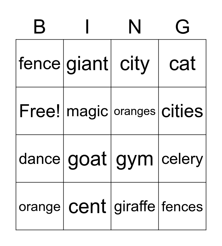 This bingo card has 16 words: cent, celery, city, fence, dance, giant, gym, giraffe, Free!, magic, orange, cat, goat, cities, oranges and fences.