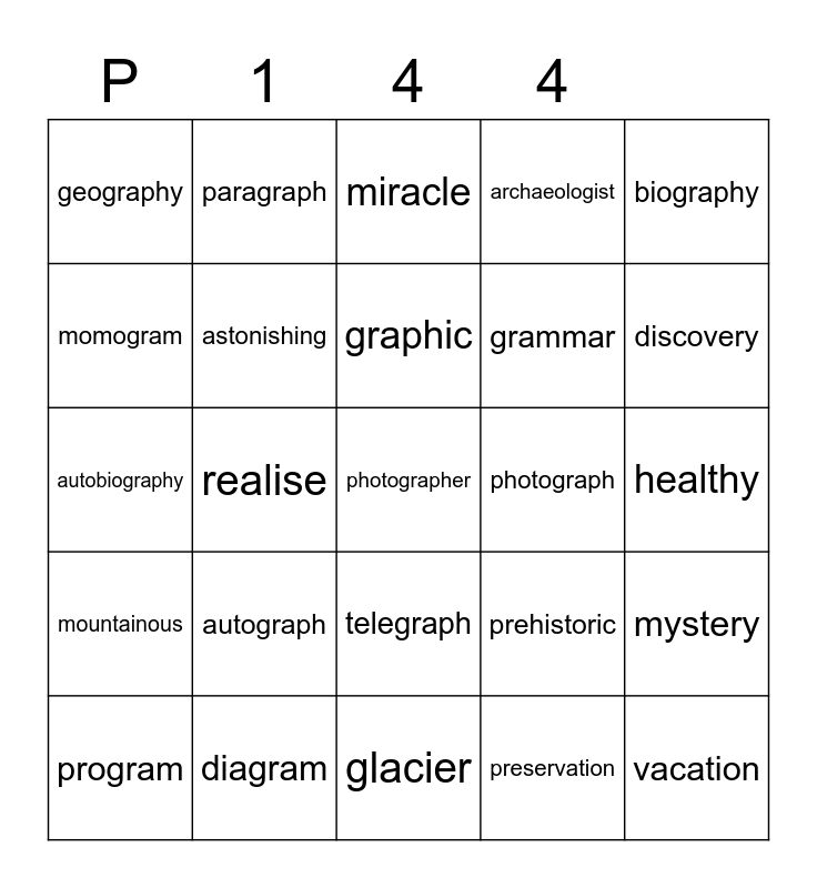 This bingo card has a free space and 24 words: autograph, diagram, graphic, program, biography, geography, momogram, paragraph, photograph, telegraph, grammar, autobiography, prehistoric, mystery, astonishing, preservation, healthy, miracle, discovery, realise, vacation, mountainous, archaeologist and glacier.