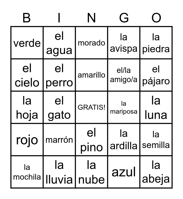 This bingo card has a free space and 34 words: blanco, azul, rosado, negro, rojo, el perro, la piedra, la mochila, el agua, el insecto, amarillo, morado, el árbol, el sol, la mariposa, el pájaro, la lluvia, la hoja, marrón, la ardilla, el pino, la flor, verde, la luna, la nube, la abeja, la avispa, la hormiga, el/la amigo/a, el cielo, el terreno, el gato, la semilla and la bicicleta.