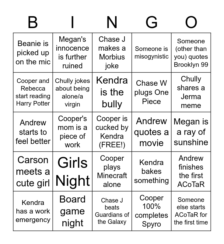 This bingo card has a free space and 24 words: Girls Night, Board game night, Kendra is the bully, Kendra has a work emergency, Someone (other than you) quotes Brooklyn 99, Beanie is picked up on the mic, Cooper and Rebecca start reading Harry Potter, Megan's innocence is further ruined, Andrew quotes a movie, Cooper plays Minecraft alone, Chase W plugs One Piece, Andrew starts to feel better, Kendra bakes something, Andrew finishes the first ACoTaR, Chully jokes about being alone/a virgin, Cooper 100% completes Spyro, Megan is a ray of sunshine, Chase J makes a Morbius joke, Chully shares a Jerma meme, Cooper's mom is a piece of work, Someone else starts ACoTaR for the first time, Carson meets a cute girl, Someone is misogynistic and Chase J beats Guardians of the Galaxy.
