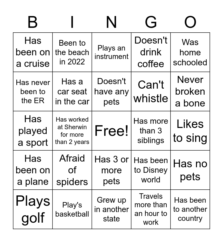 This bingo card has a free space and 26 words: Has 3 or more pets, Travels more than an hour to work, Doesn't have any pets, Play's basketball, Was home schooled, Has been on a cruise, Has never been to the ER, Been to the beach in 2022, Likes to sing, Has been to Disney world, Can't whistle, Has played a sport, Has no pets, Plays golf, Has worked at Sherwin for more than 2 years, Is an only child, Doesn't drink coffee, Has been on a plane, Plays an instrument, Has been to another country, Never broken a bone, Grew up in another state, Has more than 3 siblings, Afraid of spiders, Has a car seat in the car and Is wearing mismatch socks.