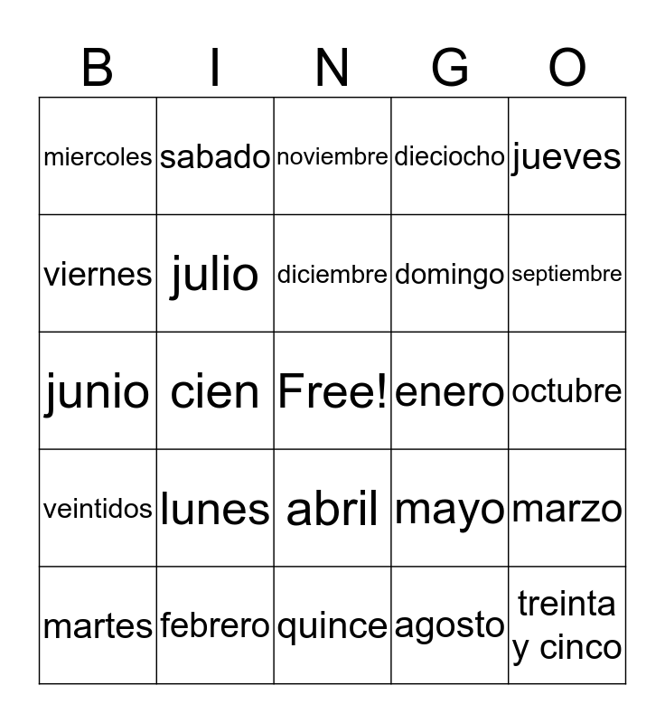 This bingo card has a free space and 24 words: lunes, febrero, diciembre, martes, jueves, miercoles, viernes, sabado, enero, abril, domingo, junio, mayo, marzo, julio, agosto, octubre, noviembre, septiembre, cien, treinta y cinco, veintidos, dieciocho and quince.