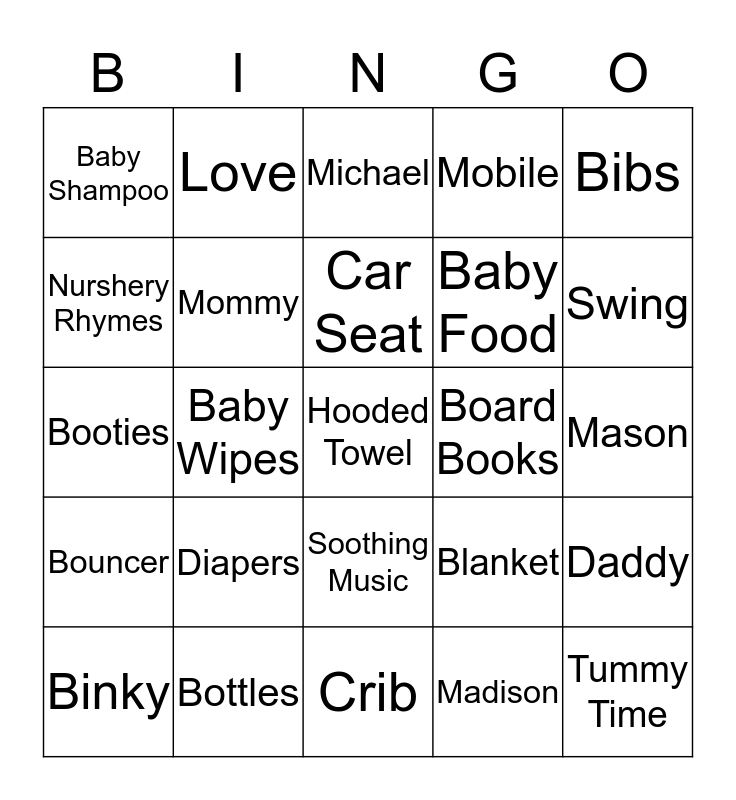 This bingo card has a free space and 24 words: Diapers, Bottles, Car Seat, Binky, Bibs, Baby Shampoo, Nurshery Rhymes, Love, Board Books, Soothing Music, Baby Food, Booties, Blanket, Daddy, Mommy, Madison, Mason, Michael, Swing, Baby Wipes, Tummy Time, Bouncer, Mobile and Crib.