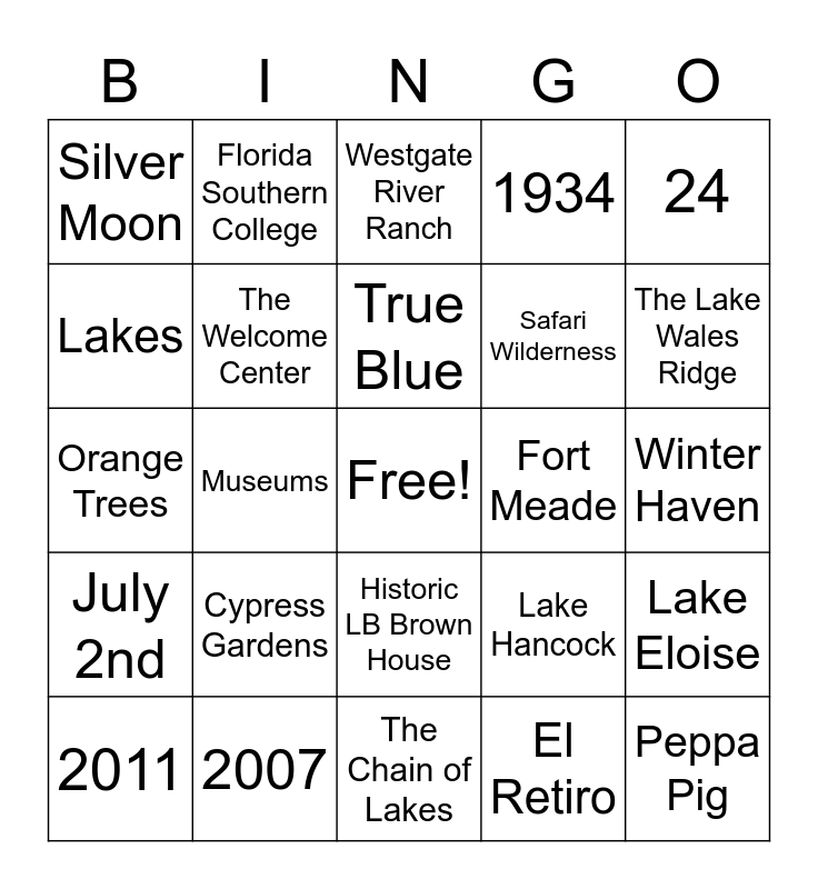 This bingo card has a free space and 25 words: Cypress Gardens, The Chain of Lakes, True Blue, 2011, 24, Silver Moon, Lakes, Florida Southern College, Fort Meade, Historic LB Brown House, Safari Wilderness, Orange Trees, Lake Hancock, Lake Eloise, The Welcome Center, Mulberry Phosphate Museum, Winter Haven, Westgate River Ranch, The Lake Wales Ridge, Museums, Peppa Pig, 2007, July 2nd, 1934 and El Retiro.