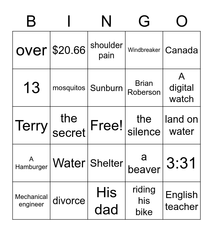This bingo card has a free space and 31 words: His dad, heart attack, the secret, green death, over, shoulder pain, mosquitos, a beaver, the silence, riding his bike, land on water, English teacher, stay positive, So., A digital watch, Himself, 3:31, Water, A Hamburger, Shelter, Canada, Throws up, Mechanical engineer, $20.66, Brian Roberson, 13, Windbreaker, Terry, divorce, Sunburn and amphibious.