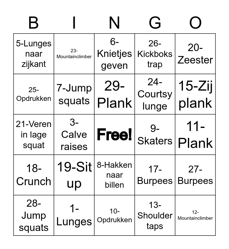 This bingo card has a free space and 30 words: 1-Lunges, 2-Squats, 3-Calve raises, 4-High knees, 5-Lunges naar zijkant, 6-Knietjes geven, 7-Jump squats, 8-Hakken naar billen, 9-Skaters, 10-Opdrukken, 11-Plank, 12-Mountainclimber, 13-Shoulder taps, 14-Commando's, 15-Zij plank, 16-Armen draaien, 17-Burpees, 18-Crunch, 19-Sit up, 20-Zeester, 21-Veren in lage squat, 22-Jumping jacks, 23-Mountainclimber, 24-Courtsy lunge, 25-Opdrukken, 26-Kickboks trap, 27-Burpees, 28-Jump squats, 29-Plank and 30-Veren in lage lunge.