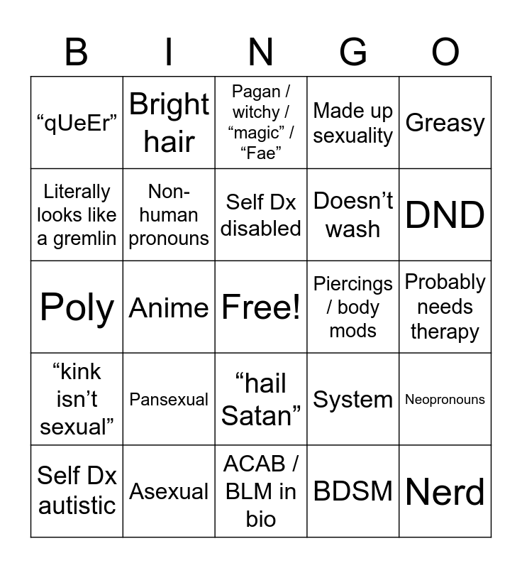 This bingo card has a free space and 24 words: Pansexual, Asexual, Self Dx disabled, Self Dx autistic, Greasy, “qUeEr”, Literally looks like a gremlin, Bright hair, Piercings / body mods, “hail Satan”, Doesn’t wash, Poly, System, Neopronouns, Non-human pronouns, BDSM, Probably needs therapy, Pagan / witchy / “magic” / “Fae”, DND, Anime, Nerd, “kink isn’t sexual”, Made up sexuality and ACAB / BLM in bio.