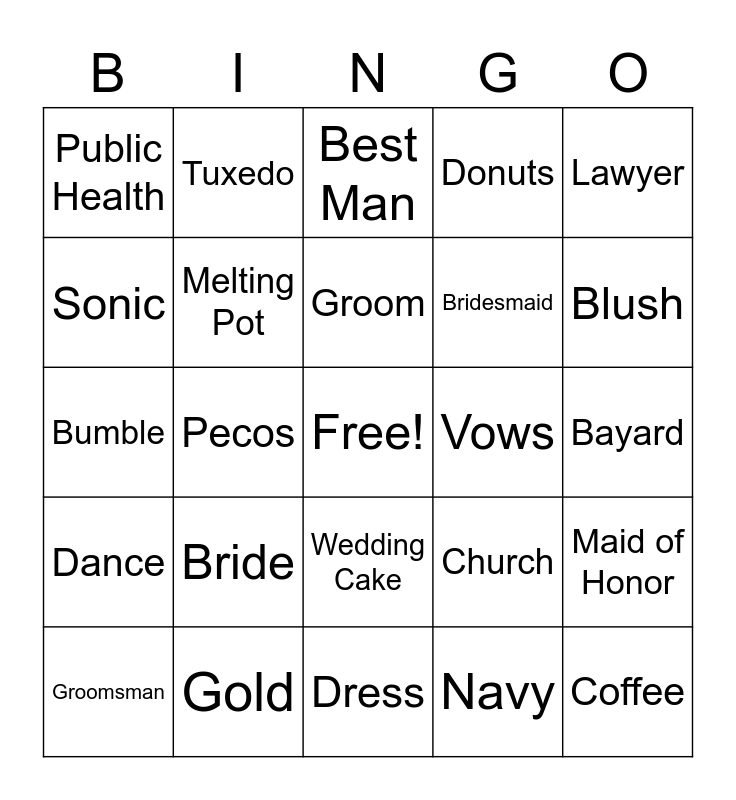 This bingo card has a free space and 24 words: Bride, Gold, Groom, Groomsman, Lawyer, Public Health, Sonic, Tuxedo, Vows, Wedding Cake, Bridesmaid, Bumble, Church, Maid of Honor, Melting Pot, Navy, Bayard, Best Man, Blush, Pecos, Coffee, Dance, Donuts and Dress.