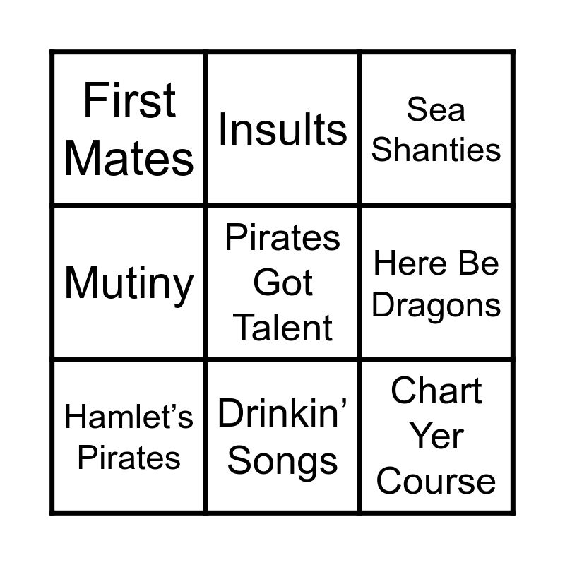 This bingo card has 15 words: Free!, Storm’s A Brewin’, Sea Shanties, First Mates, Drinkin’ Songs, Pirates Got Talent, Walk the Plank, Pirate’s Favorite Letter, Here Be Dragons, Chart Yer Course, Calmer Ports, Mutiny, Hamlet’s Pirates, Insults and Swashbucklin’.