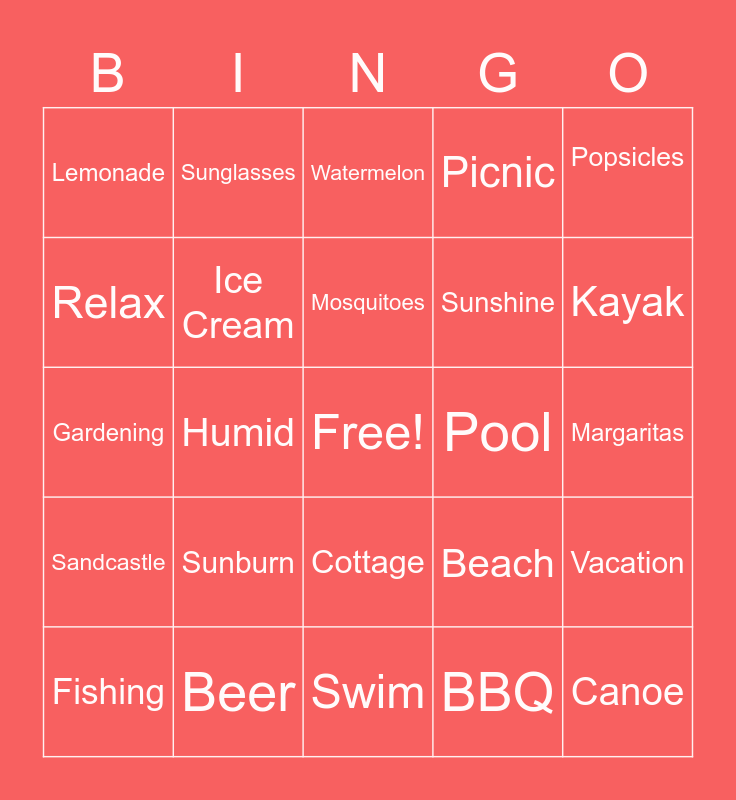 This bingo card has a free space and 24 words: Sunburn, Beer, Mosquitoes, Fishing, Popsicles, Lemonade, Relax, Sunglasses, Pool, Cottage, Sunshine, Gardening, Beach, Vacation, Ice Cream, BBQ, Margaritas, Watermelon, Kayak, Humid, Canoe, Sandcastle, Picnic and Swim.
