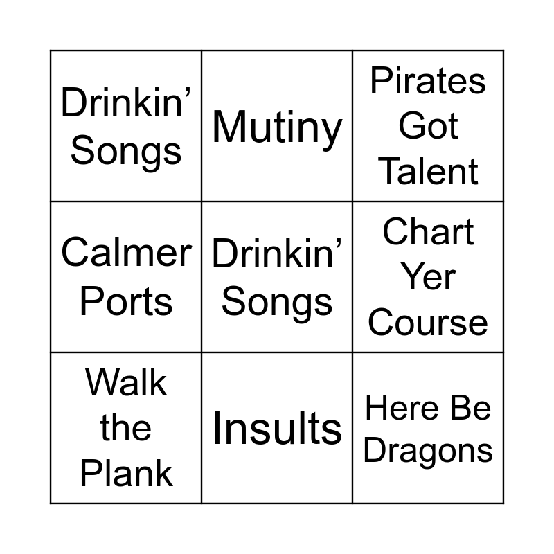 ⚠ This card has duplicate items: Storm’s A Brewin’ (2), Sea Shanties (2), First Mates (2), Drinkin’ Songs (2), Pirates Got Talent (2), Walk the Plank (2), Pirate’s Favorite Letter (2), Here Be Dragons (2), Chart Yer Course (2), Calmer Ports (2), Mutiny (2), Hamlet’s Pirates (2), Insults (2), Swashbucklin’ (2)