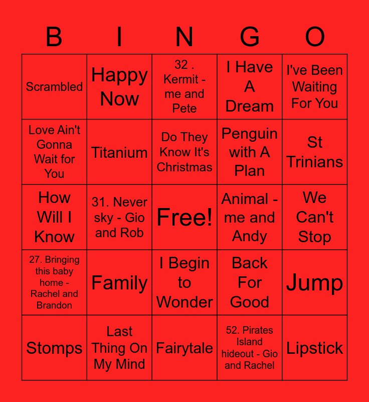 This bingo card has a free space and 401 words: 20. Super moves - Thomas me and Rachel, Can't Get You Out Of My Head, Say You'll Be There, Better Best Forgotten, I've Been Waiting For You, Mamma Mia, 54. I've got pizzazz - me and Louise, More Than Friends, If I Were A Boy, 17. Walking the plank - Andy and Rob, When All Is Said and Done, Set Fire To The Rain, A Million Love Songs, The Climb, Slipping Through My Fingers, Lost In Music, Jump Jump Star, Wrecking Ball, 4. Seasons - Rachel and Andy, Steady and Slow, Burn, Wannabe, Kidz, Waterloo, Story Of A Heart, 10. Picture You - Flo and Me, Airplanes, Never Had A Dream Come True, Bring It All Back, 32 . Kermit - me and Pete, When Love Takes Over, 29. Upside-downsy Conga - Pete and Hannah, History, Money Money Money, 49. I don't know what I've been told - me Rachel Rob and Flo, When You're Gone, Shackles, CITV, Wings, I Begin to Wonder, What Makes You Beautiful, Last Thing On My Mind, Easier, 26. The hugglemonster way - Rachel and Rob, Wake Me Up, Chain Reaction, What I've Been Looking For, Rule The World, 53. Hot hot lava - me and Gio, No Good Advice, Black Magic, Tears, Out Of Our Heads, Reach, 16. Mousekadoer - James and Me, I'm A Celebrity, Somewhere Only We Know, Is It True, Na Na Hey Hey Kiss Him Goodbye, Two In A Million, Don't Stop Movin, 58. Hey hey owlette - Rachel and Rob, No More Sad Songs, Cheap Thrills, Scared of the Dark, Summer's Lullaby, Animal - me and Andy, Run, 2 Become 1, Titanium, Stayin Alive, Reggaeton Lento, Anymore, Salute, 9. Super singing Heroes - Rachel and David, Parachute, Waterline, Playtime, 25. The summer dances - everyone, Nativity 3, Fozzie - Me and Thomas, Who Do You Think You Are, Put Yourself In My Place, Breaking Free, St Trinians, Love Me Like You Do, Pretend, Lush Life, Amarillo, 27. Bringing this baby home - Rachel and Brandon, The Chase, Smile Please, 46. I belong - me and Jo, Shake Your Body, Spinning Around, Little Me, Hallelujah, 55. Chugga chugga - Grace and Rob, Bass Face, That's My Girl, Cartoonito, 48. Hello Christmas - me and Rachel, We Can't Stop, Natural, Gimme Gimme Gimme, A Moment Like This, 22. Spine Chiller - Ben and Rob, One For Sorrow, Muppet Babies, 24. PJ masks and feeling great - Pete and Andy, 2. Bubbly Blue - Gio and Andy, Biology, CBBC, Fight For This Love, The Greatest Dancer, You Are Not Alone, Something Kinda Ooh, Colours, Rolling In The Deep, Deeper Shade Of Blue, I'm Still Standing, Music, 37. Stuffy the Great - Hannah and me, Glorious, 34. Perfect slumber party - Ben and me, Good Mood, 19. The spotlight - me and Rachel, 43. Disney junior song - everyone, Goodbye, Greatest Day, Especially For You, Please Don't Let Me Go, Kids, Ruff Ruff Tweet and Dave, See The Day, Rewrite The Stars, Long Hot Summer, Brave heart, 13. I can't cuddle - Andy and Flo, 7. Hero - Me and Rachel, Steady and Slow, Heart Skips a Beat, No More Tears Enough, Hero, 5678, 52. Pirates Island hideout - Gio and Rachel, Too Much, 8. Count on Us - Flo and Hannah, Dance With Me Tonight, Cha Cha Slide, 59. I'm Luna girl - me and Rachel, Love at first sight, Piggy - Jo and me, Unpredictable, 40. Choo-choo boogie - Rob and James, Dear Darlin, YMCA, 15. Picture perfect - Phil and Louise, Could It Be Magic, Yoga, The Winner Takes It All, I Have A Dream, Hair, Here It Comes Again, Heartbreak In This City, Make Your Own Kind Of Music, Could It Be Magic, Think About Us, 41. KC's lullaby - me and Rachel, Stomp, Oops I Did It Again, UP, Power, Viva Forever, The Voice, Puppy Love, These Days, Pack Up, My Love My Life, Better The Devil you Know, Drag Me Down, Ooh la la, I Do I Do I Do I Do I Do, Hi-5, Something New, My Love My Life, Patience, Shine, 17, 1. Hot Dog - James and Melissa, One and One, Animals, Story Of My Life, What Makes You Beautiful, Somebody Else's Guy, Tragedy, 57. Everybody's good at something - Rob Paul and me, Nativity, Angel Eyes, Dancing Queen, The Flood, 31. Never sky - Gio and Rob, All About The Bass, I Think Were Alone Now, Tell Me Ma, 12. I've been there buddy - Rob and Rachel, Honey Honey, Unpredictable, Chiquitita, Lazy Song, Always, Best Song Ever, Let Me Down, 44. Never land pirate band - Gio and Beckie, With Ur Love, 2 Hearts, Feelings, 56. I'm on the case - me and Rachel, No, Live While Were Young, 33. Ready for action - me and Eve, Fozzie, Number 1, Friends, 50. Weather - me and Flo, Year 3000, I Should be so Lucky, Spice Up Your Life, Raining Sunshine, Alive, 51. Tap tap tap your feet - me and Beckie, 28. A bicycle built for two - James and Brandon, Life of Riley, Summer Of Love, Shout Out To My Ex, At Last, Never Too Late, Gonzo, Me And My Broken Heart, Venus, Kermit, Voulez Vous, Night Changes, Stay The Night, I Know him so well, The Scientist, When I Kissed The Teacher, Family, 35. The clubhouse birthday party - James and Melissa, Take A Chance On Me, 47. Summer square dance - Rob me Rachel and Paul, Stomps, Do They Know It's Christmas, Milkshake, Step Back In Time, Call Me, Grenade, 21. Royal Fun - Flo and me, Just Give Me A Reason, Say You'll Be Mine, Never Forget, Someone You Loved, 36. Cedric the Great - rob and Paul, Lay All Your Love On Me, Songs, 30. Tots Theme - Rob me and Rachel, Tobogganing, Disney Junior, 5. Beach night party - Pete and Rob, Cest la Vie, What The Future Holds, Heartbeat, Knowing Me Knowing You, Nothing Scares Me, Never have to say goodbye, Young Hearts Run Free, Secret Love Song, Start up your imagination, Beat Of My Drum, Newsround, 23. Anything - Rachel and me, Nick Jr, 45. Mighty Little Gekko - Dave and Amy, Headlines, Happy Now, Tiger Feet, Pray, I'll Stand By You, The Show, I Turn to You, Scrambled, Flames, Dynamite, Love Machine, You Don't Know Love, Does Your Mother Know, Not Tonight Santa, Fly On The Wings of Love, Loco Motion, Cannonball, Eurovision, Paw Patrol, Can't Speak French, Geno, Roar, 11. Everyday fun - Beckie and Me, Footprints in the sand, Let Me Entertain You, Don't Stop Believin, Life Got Cold, KC's Lullaby, Call The Shots, 3. Traini