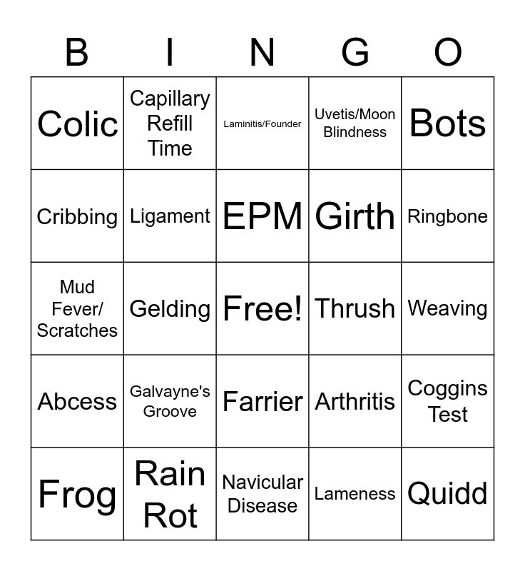 This bingo card has a free space and 29 words: Frog, Conformation, Gelding, Worms, Colic, Laminitis/Founder, Ligament, Galvayne's Groove, Thrush, Rain Rot, Weaving, Quidd, Navicular Disease, Lameness, Ringbone, Withers, Farrier, Abcess, Bots, Mud Fever/ Scratches, Arthritis, Strangles, Girth, Cribbing, Uvetis/Moon Blindness, Capillary Refill Time, Coggins Test, EPM and vaccinations.