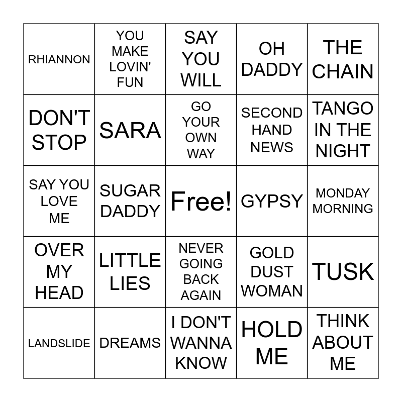 This bingo card has a free space and 24 words: LITTLE LIES, DREAMS, GO YOUR OWN WAY, LANDSLIDE, THE CHAIN, RHIANNON, DON'T STOP, YOU MAKE LOVIN' FUN, GYPSY, NEVER GOING BACK AGAIN, SECOND HAND NEWS, SAY YOU LOVE ME, GOLD DUST WOMAN, TUSK, SARA, HOLD ME, MONDAY MORNING, SAY YOU WILL, TANGO IN THE NIGHT, SUGAR DADDY, THINK ABOUT ME, OVER MY HEAD, OH DADDY and I DON'T WANNA KNOW.