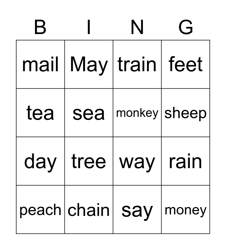 This bingo card has 16 words: chain, rain, train, mail, day, May, way, say, tea, sea, peach, feet, tree, sheep, monkey and money.