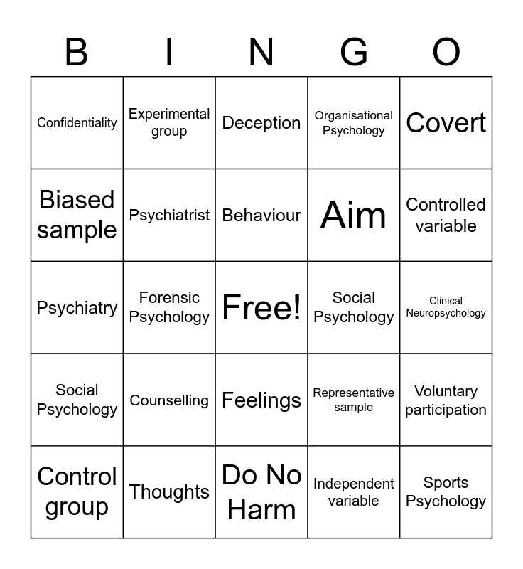This bingo card has a free space and 41 words: Psychology, Psychiatry, Psychologist, Psychiatrist, Thoughts, Feelings, Behaviour, Overt, Covert, Social Psychology, Forensic Psychology, Organisational Psychology, Sports Psychology, Clinical Neuropsychology, Social Psychology, Counselling, Informed consent, Confidentiality, Withdrawal rights, Deception, Voluntary participation, Debriefing, Do No Harm, Aim, Hypothesis, Variable, Independent variable, Dependent variable, Controlled variable, Extraneous variable, Confounding variable, Experimental group, Control group, Population, Representative sample, Biased sample, Random sampling/ random allocation, Qualitative data, Quantitative data, Primary data and Secondary data.