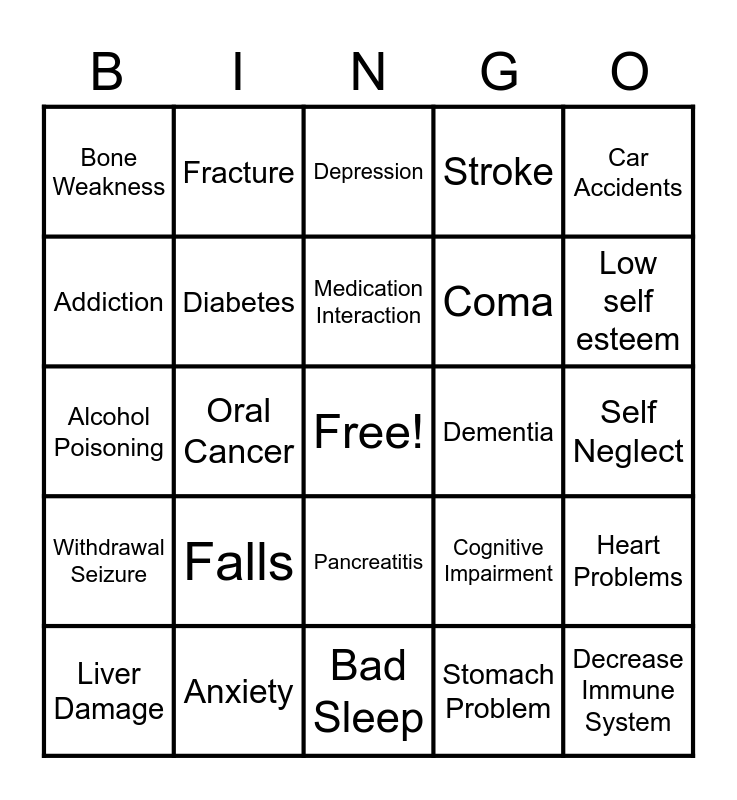 This bingo card has a free space and 24 words: Liver Damage, Falls, Medication Interaction, Stomach Problem, Car Accidents, Bone Weakness, Fracture, Depression, Dementia, Self Neglect, Alcohol Poisoning, Diabetes, Cognitive Impairment, Heart Problems, Addiction, Anxiety, Bad Sleep, Stroke, Low self esteem, Withdrawal Seizure, Oral Cancer, Pancreatitis, Coma and Decrease Immune System.