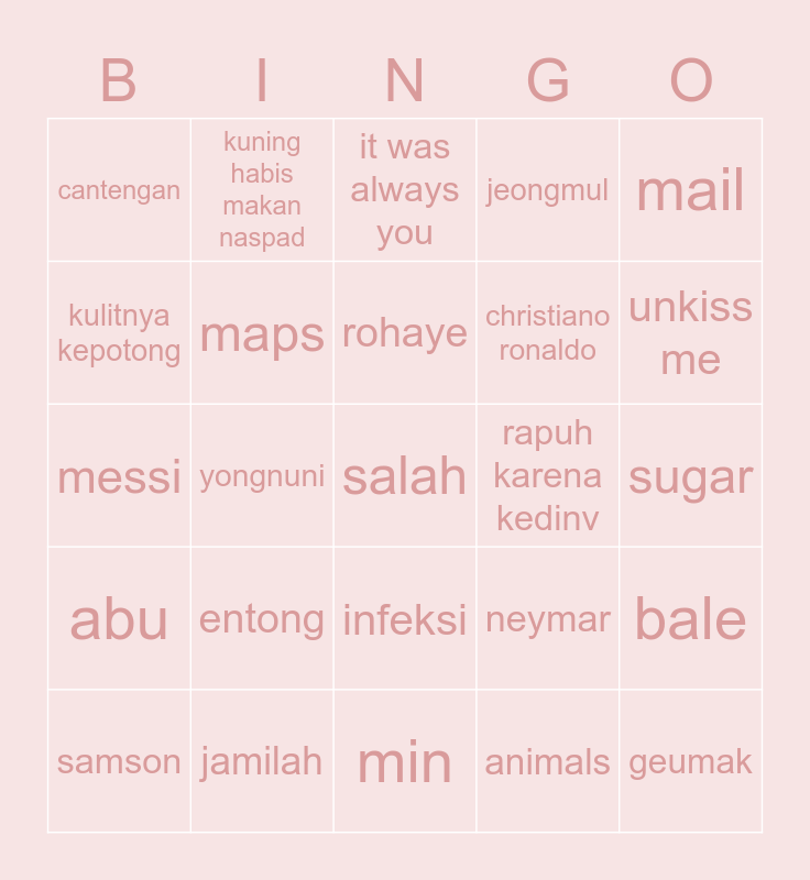 This bingo card has a free space and 24 words: entong, jamilah, rohaye, samson, mail, cantengan, kulitnya kepotong, kuning habis makan naspad, rapuh karena kedinv, infeksi, christiano ronaldo, messi, neymar, bale, maps, animals, sugar, it was always you, unkiss me, yongnuni, geumak, abu, jeongmul and min.