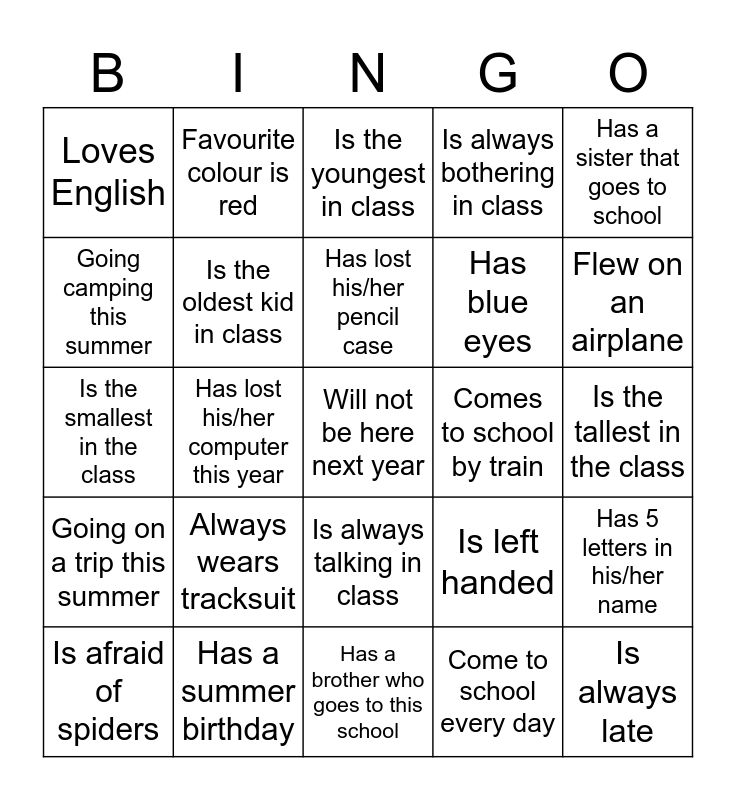This bingo card has 25 words: Going on a trip this summer, Has a summer birthday, Will not be here next year, Come to school every day, Has a sister that goes to school, Loves English, Favourite colour is red, Is the youngest in class, Comes to school by train, Has 5 letters in his/her name, Going camping this summer, Is the oldest kid in class, Has a brother who goes to this school, Is left handed, Flew on an airplane, Is afraid of spiders, Has lost his/her computer this year, Has lost his/her pencil case, Has blue eyes, Is the tallest in the class, Is the smallest in the class, Always wears tracksuit, Is always talking in class, Is always bothering in class and Is always late.