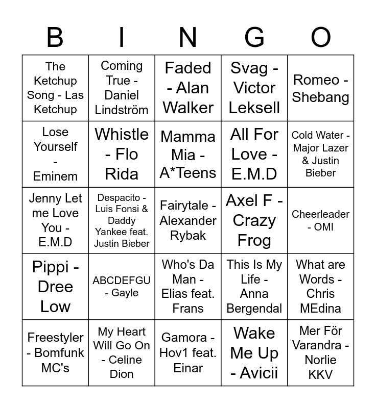 This bingo card has a free space and 24 words: ABCDEFGU - Gayle, My Heart Will Go On - Celine Dion, Mamma Mia - A*Teens, Freestyler - Bomfunk MC's, Romeo - Shebang, The Ketchup Song - Las Ketchup, Lose Yourself - Eminem, Coming True - Daniel Lindström, Axel F - Crazy Frog, Who's Da Man - Elias feat. Frans, All For Love - E.M.D, Jenny Let me Love You - E.M.D, This Is My Life - Anna Bergendal, What are Words - Chris MEdina, Whistle - Flo Rida, Wake Me Up - Avicii, Cheerleader - OMI, Faded - Alan Walker, Cold Water - Major Lazer & Justin Bieber, Despacito - Luis Fonsi & Daddy Yankee feat. Justin Bieber, Mer För Varandra - Norlie KKV, Pippi - Dree Low, Svag - Victor Leksell and Gamora - Hov1 feat. Einar.