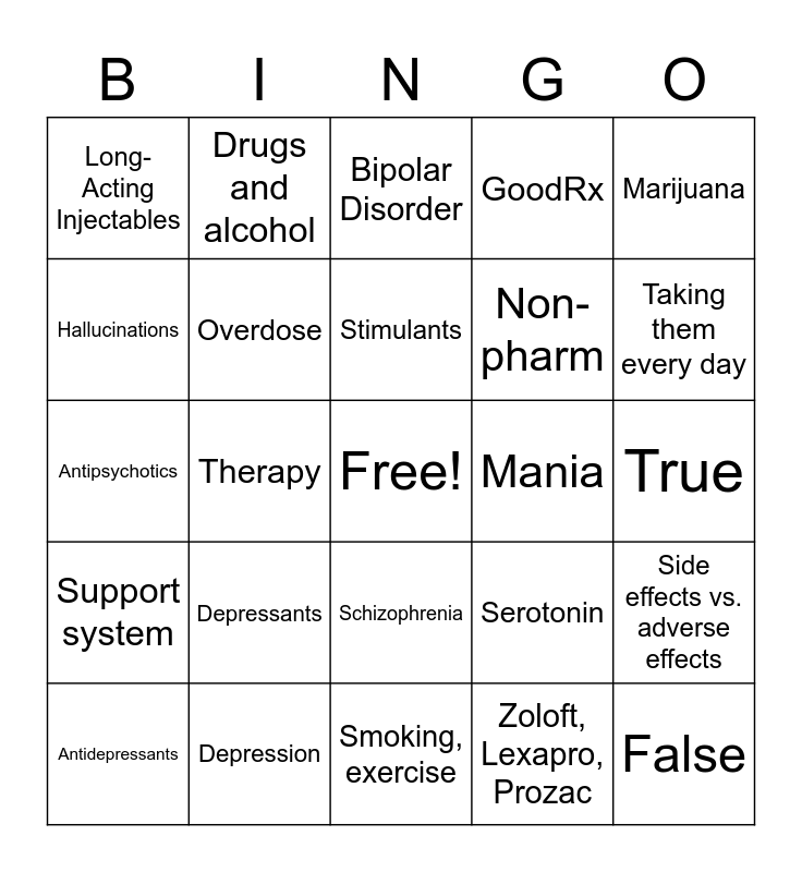 This bingo card has a free space and 24 words: Depressants, Depression, Stimulants, Antidepressants, Marijuana, Long-Acting Injectables, Hallucinations, Drugs and alcohol, Mania, Schizophrenia, Non-pharm, Antipsychotics, Serotonin, Side effects vs. adverse effects, Overdose, Zoloft, Lexapro, Prozac, True, Bipolar Disorder, Taking them every day, Therapy, False, Support system, GoodRx and Smoking, exercise.
