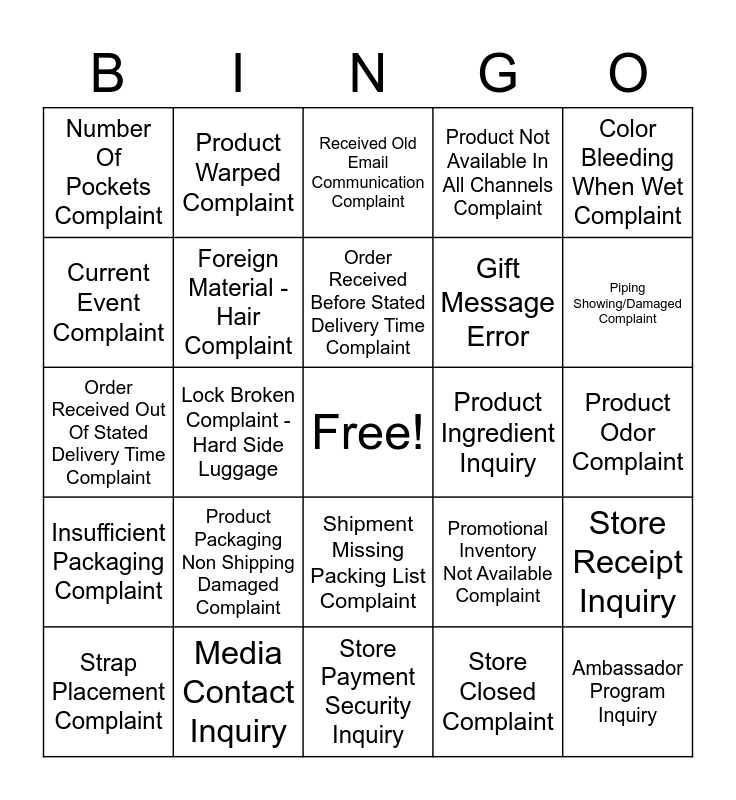 This bingo card has a free space and 101 words: Add To Text Message List Complaint, Annual Outlet Sale General Information Inquiry, Color Bleeding When Wet Complaint, Component Missing Complaint - Hangtag, Container Cracked/Broken Complaint, Copy Of Packing List Inquiry, Corporate Lack Of Follow Up Complaint, Cracking Or Peeling Complaint, Customer Service Lack Of Effort Complaint, Dimension Confusion Complaint, Employee Did Not Follow Policy, Employee Return Inquiry, Glue Residue Complaint, Hours Of Operation Inquiry, In Store Event Complaint, Incorrect Size Received, Insufficient Packaging Complaint, International Unable To Order Sale Product Complaint, Lack Of Repair Service Complaint, Lock Function/Instruction Complaint, Name Plate Placement Incorrect Complaint, No Employee Greeting Complaint, Order Received - Card Not Used Fraud Complaint, Pay For Refunded Order Or Nco Inquiry, Physical Gift Card Inquiry, Piping Showing/Damaged Complaint, Product Not Available In All Channels Complaint, Product Packaging Non Shipping Damaged Complaint, Product Upc Code Inquiry, Product Use Praise, Product Warped Complaint, Received Old Email Communication Complaint, Recently Purchased Items Now On Sale Complaint, Register Employee Rude Service Complaint, Return Policy Requirements Complaint, Shipment Missing Packing List Complaint, Shipping Destination Restriction Complaint, Specific Style Praise, Store Closed Complaint, Store Payment Security Inquiry, Store Service Positive Praise, Strap Placement Complaint, Additional Fees Non Shipping Too High Complaint, Alleged Personal Injury Complaint, Alleged Property Damage Complaint, Ambassador Program Inquiry, Color Bleeding During Wash Complaint, Coloration Incorrect Complaint, Corporate Brand Complaint, Corporate Brand Positive Praise, Corporate Customer Service Praise, Current Event Complaint, Customer Service Incorrect Information Complaint, Customer Service Location Inquiry, Customization - Construction Complaint, Delivery Service Level Not Met Complaint, Did Not Place Order - Gift Card Fraud Complaint, Did Not Receive Shipping Confirmation Email, Discontinued Style Complaint, Floor Employee Rude Service Complaint, Foreign Material - Hair Complaint, Foreign Material - Mold Complaint, Foreign Material - Other Complaint, Form Of Payment Restriction Complaint, Free Product Request General Inquiry, Gift Message Error, International Unable To Redeem Promotion Complaint, Lock Broken Complaint - Hard Side Luggage, Media Contact Inquiry, Multiple Shipments Complaint, Narvar Return Package Delay Complaint, Not Receiving E-Mail Offers Complaint, Number Of Pockets Complaint, Order Praise, Order Received Before Stated Delivery Time Complaint, Order Received Out Of Stated Delivery Time Complaint, Personalization Stitching Complaint, Personalization Wouldn't Produce My Request Complaint, Place Rush for PR Order, Pos Error, Price Increase - Retailer Price Sticker Request, Product Ingredient - Prop 65 Complaint, Product Ingredient Inquiry, Product Lining Complaint, Product Not Available Backorder Complaint, Product Not Made In United States Complaint, Product Odor Complaint, Product Sold In Unapproved Channel Complaint, Product Too Expensive Complaint, Product Weight Rating Inquiry, Promotional Inventory Not Available Complaint, Quilting Inconsistent Complaint, Return Refused Complaint, Store Location Request Inquiry, Store Promotion Participation Inquiry, Store Receipt Inquiry, Strap Length Complaint, Survey Legitimacy Inquiry, Vera Bradley Logo Complaint, Website Navigation Positive Praise and Wheel Defective Complaint.