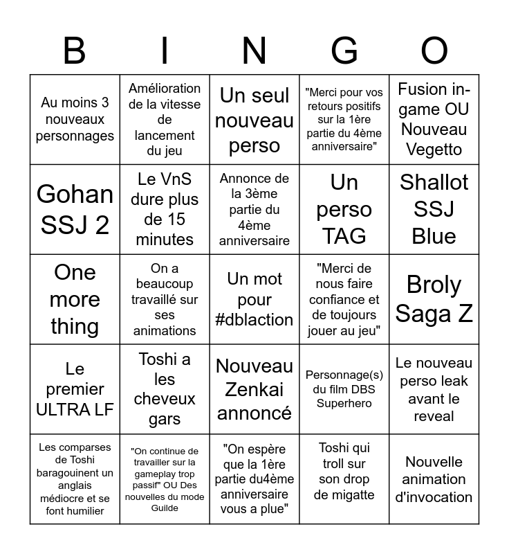 This bingo card has a free space and 25 words: Toshi a les cheveux gars, "On espère que la 1ère partie du4ème anniversaire vous a plue", Annonce de la 3ème partie du 4ème anniversaire, Les comparses de Toshi baragouinent un anglais médiocre et se font humilier, Fusion in-game OU Nouveau Vegetto, Au moins 3 nouveaux personnages, Gohan SSJ 2, Amélioration de la vitesse de lancement du jeu, "Merci de nous faire confiance et de toujours jouer au jeu", Nouveau Zenkai annoncé, Un perso TAG, One more thing, Personnage(s) du film DBS Superhero, Le nouveau perso leak avant le reveal, Le VnS dure plus de 15 minutes, Un personnage ULTRA, Broly Saga Z, Un seul nouveau perso, Shallot SSJ Blue, On a beaucoup travaillé sur ses animations, Nouvelle animation d'invocation, "On continue de travailler sur la gameplay trop passif" OU Des nouvelles du mode Guilde, Le premier ULTRA LF, "Merci pour vos retours positifs sur la 1ère partie du 4ème anniversaire" and Toshi qui troll sur son drop de migatte.