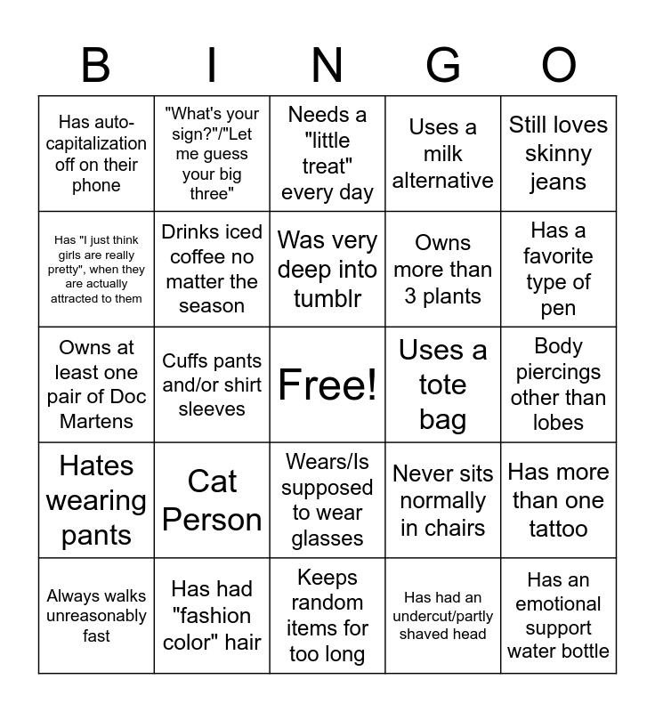 This bingo card has a free space and 24 words: Cat Person, Has had "fashion color" hair, Was very deep into tumblr, Always walks unreasonably fast, Still loves skinny jeans, Has auto-capitalization off on their phone, Has "I just think girls are really pretty", when they are actually attracted to them, "What's your sign?"/"Let me guess your big three", Uses a tote bag, Wears/Is supposed to wear glasses, Owns more than 3 plants, Owns at least one pair of Doc Martens, Never sits normally in chairs, Has more than one tattoo, Drinks iced coffee no matter the season, Has had an undercut/partly shaved head, Body piercings other than lobes, Needs a "little treat" every day, Has a favorite type of pen, Cuffs pants and/or shirt sleeves, Has an emotional support water bottle, Hates wearing pants, Uses a milk alternative and Keeps random items for too long.