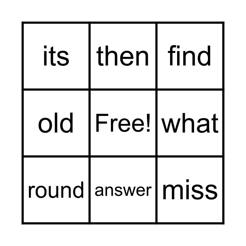 This bingo card has a free space and 10 words: answer, find, its, miss, old, round, then, until, what and young.