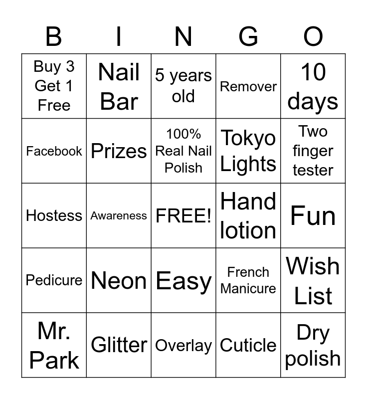 This bingo card has a free space and 24 words: Neon, Glitter, 100% Real Nail Polish, Mr. Park, 10 days, Buy 3 Get 1 Free, Facebook, Nail Bar, Hand lotion, Easy, Tokyo Lights, Hostess, French Manicure, Wish List, Prizes, Cuticle, Fun, 5 years old, Two finger tester, Awareness, Dry polish, Pedicure, Remover and Overlay.