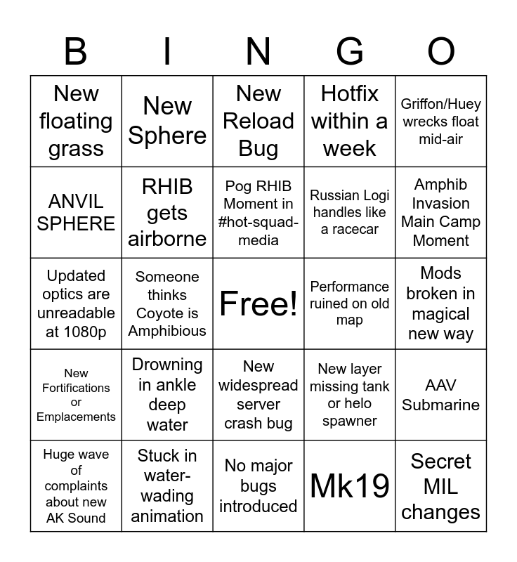 This bingo card has a free space and 24 words: Drowning in ankle deep water, Stuck in water-wading animation, Pog RHIB Moment in #hot-squad-media, Huge wave of complaints about new AK Sound, Griffon/Huey wrecks float mid-air, New floating grass, ANVIL SPHERE, New Sphere, Performance ruined on old map, New widespread server crash bug, Russian Logi handles like a racecar, Updated optics are unreadable at 1080p, New layer missing tank or helo spawner, AAV Submarine, RHIB gets airborne, Mk19, Mods broken in magical new way, New Reload Bug, Amphib Invasion Main Camp Moment, Someone thinks Coyote is Amphibious, Secret MIL changes, New Fortifications or Emplacements, Hotfix within a week and No major bugs introduced.