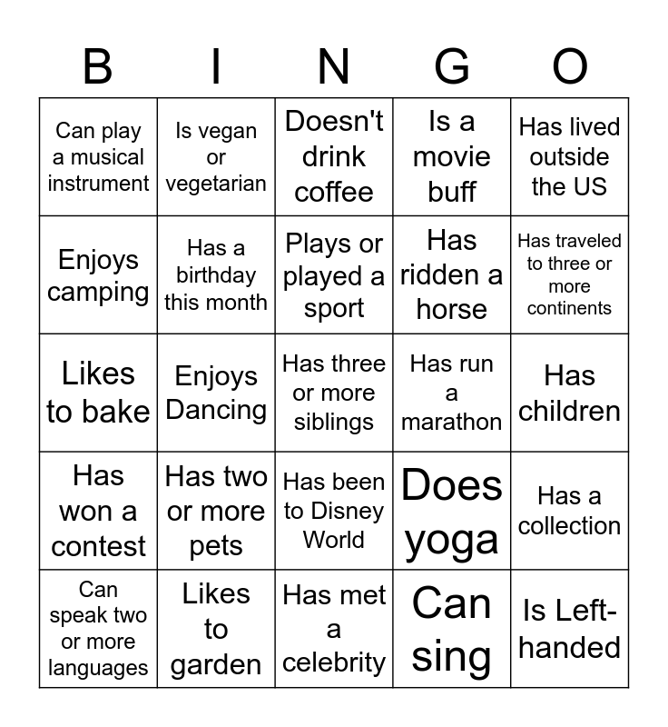 This bingo card has a free space and 24 words: Has two or more pets, Likes to garden, Plays or played a sport, Can speak two or more languages, Has lived outside the US, Can play a musical instrument, Enjoys camping, Is vegan or vegetarian, Has run a marathon, Has been to Disney World, Has ridden a horse, Likes to bake, Does yoga, Has a collection, Has a birthday this month, Can sing, Has children, Doesn't drink coffee, Has traveled to three or more continents, Enjoys Dancing, Is Left-handed, Has won a contest, Is a movie buff and Has met a celebrity.