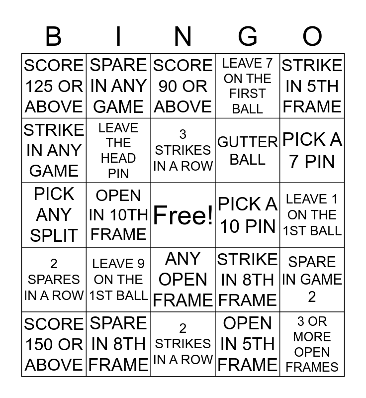 This bingo card has a free space and 24 words: LEAVE 9 ON THE 1ST BALL, SPARE IN 8TH FRAME, 3 STRIKES IN A ROW, SCORE 150 OR ABOVE, STRIKE IN 5TH FRAME, SCORE 125 OR ABOVE, STRIKE IN ANY GAME, SPARE IN ANY GAME, PICK A 10 PIN, ANY OPEN FRAME, GUTTER BALL, PICK ANY SPLIT, STRIKE IN 8TH FRAME, SPARE IN GAME 2, LEAVE THE HEAD PIN, OPEN IN 5TH FRAME, LEAVE 1 ON THE 1ST BALL, SCORE 90 OR ABOVE, PICK A 7 PIN, OPEN IN 10TH FRAME, 3 OR MORE OPEN FRAMES, 2 SPARES IN A ROW, LEAVE 7 ON THE FIRST BALL and 2 STRIKES IN A ROW.