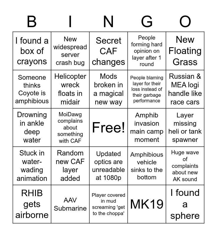 This bingo card has a free space and 24 words: Random new CAF layer added, AAV Submarine, Mods broken in a magical new way, RHIB gets airborne, New Floating Grass, I found a box of crayons, Someone thinks Coyote is amphibious, New widespread server crash bug, Amphib invasion main camp moment, Updated optics are unreadable at 1080p, People blaming layer for their loss instead of their garbage performance, Drowning in ankle deep water, Amphibious vehicle sinks to the bottom, Huge wave of complaints about new AK sound, Helicopter wreck floats in midair, MK19, Layer missing heli or tank spawner, Secret CAF changes, Russian & MEA logi handle like race cars, MoiDawg complains about something with CAF, I found a sphere, Stuck in water-wading animation, People forming hard opinion on layer after 1 round and Player covered in mud screaming 'get to the choppa'.