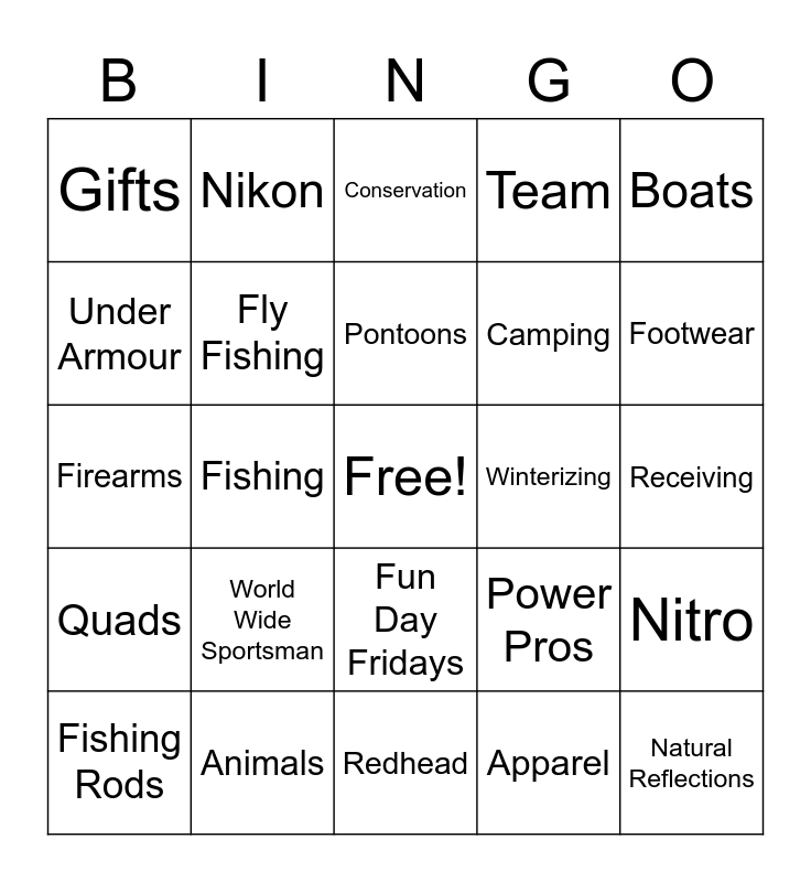 This bingo card has a free space and 52 words: Ascend, Natural Reflections, Bob Timberlake, Redhead, World Wide Sportsman, Browning, Nikon, Carhart, Under Armour, Sales, Fly Fishing, Mercury, Nitro, Power Pros, Targa, Pro Guide, Pontoons, Winterizing, Marine, Boats, Fishing, Apparel, Gifts, Camping, Hunting, Shooting, Archery, Camouflage, Footwear, Tracker, Customer Service, Team, Team work, Events, Kids, Conservation, Animals, Environment, Star, Sunglass Hut, Outdoor Rewards, Receiving, Quads, Wellness, Fun Day Fridays, She Outdoors, Cabela's, Firearms, Tents, Sleeping Bags, Fishing Rods and Activities.