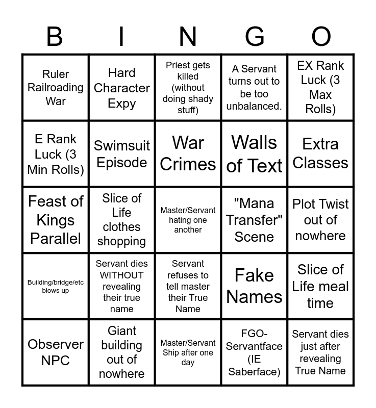 This bingo card has 25 words: Servant dies WITHOUT revealing their true name, Master/Servant Ship after one day, War Crimes, Observer NPC, EX Rank Luck (3 Max Rolls), Ruler Railroading War, E Rank Luck (3 Min Rolls), Hard Character Expy, "Mana Transfer" Scene, Servant refuses to tell master their True Name, Walls of Text, Feast of Kings Parallel, Fake Names, Slice of Life meal time, Swimsuit Episode, Servant dies just after revealing True Name, Plot Twist out of nowhere, Priest gets killed (without doing shady stuff), Extra Classes, Slice of Life clothes shopping, Master/Servant hating one another, Giant building out of nowhere, Building/bridge/etc blows up, A Servant turns out to be too unbalanced. and FGO-Servantface (IE Saberface).