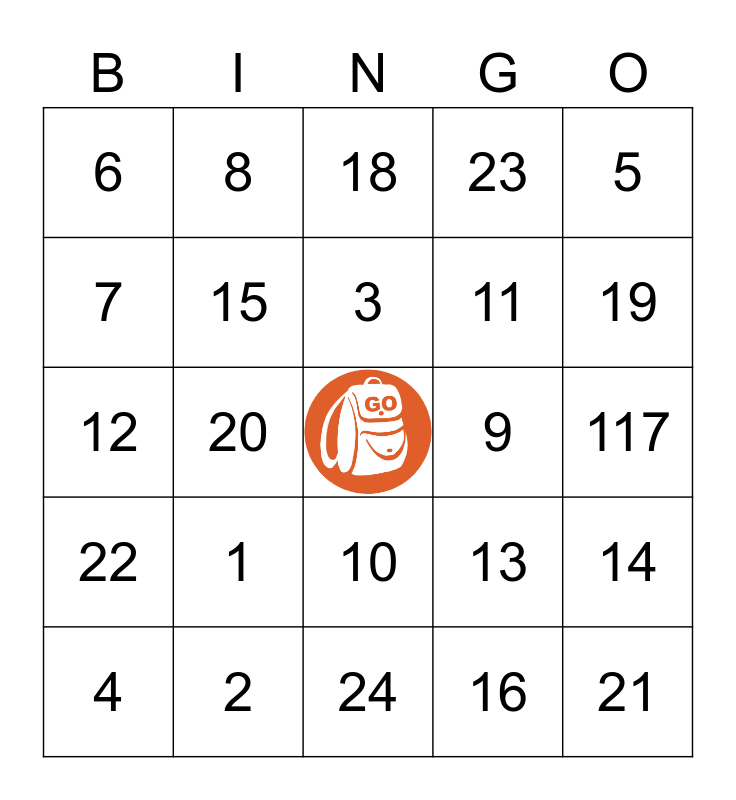 This bingo card has a free space and 24 words: 1, 2, 3, 4, 5, 6, 7, 8, 9, 10, 11, 12, 13, 14, 15, 16, 117, 18, 19, 20, 21, 22, 23 and 24.