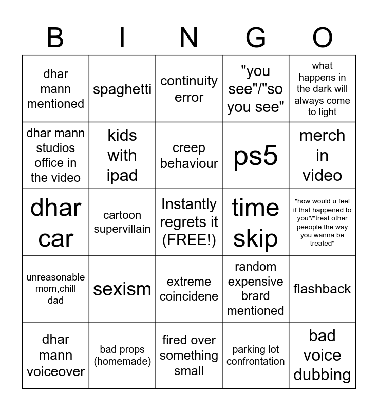 This bingo card has a free space and 24 words: sexism, bad props (homemade), creep behaviour, dhar mann voiceover, what happens in the dark will always come to light, dhar mann mentioned, dhar mann studios office in the video, spaghetti, time skip, extreme coincidene, ps5, dhar car, random expensive brard mentioned, flashback, kids with ipad, parking lot confrontation, "how would u feel if that happened to you"/"treat other peeople the way you wanna be treated", continuity error, merch in video, cartoon supervillain, bad voice dubbing, unreasonable mom,chill dad, "you see"/"so you see" and fired over something small.