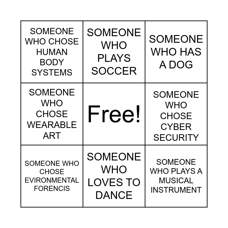 This bingo card has a free space and 8 words: SOMEONE WHO CHOSE CYBER SECURITY, SOMEONE WHO HAS A DOG, SOMEONE WHO PLAYS SOCCER, SOMEONE WHO CHOSE EVIRONMENTAL FORENCIS, SOMEONE WHO CHOSE HUMAN BODY SYSTEMS, SOMEONE WHO PLAYS A MUSICAL INSTRUMENT, SOMEONE WHO CHOSE WEARABLE ART and SOMEONE WHO LOVES TO DANCE.
