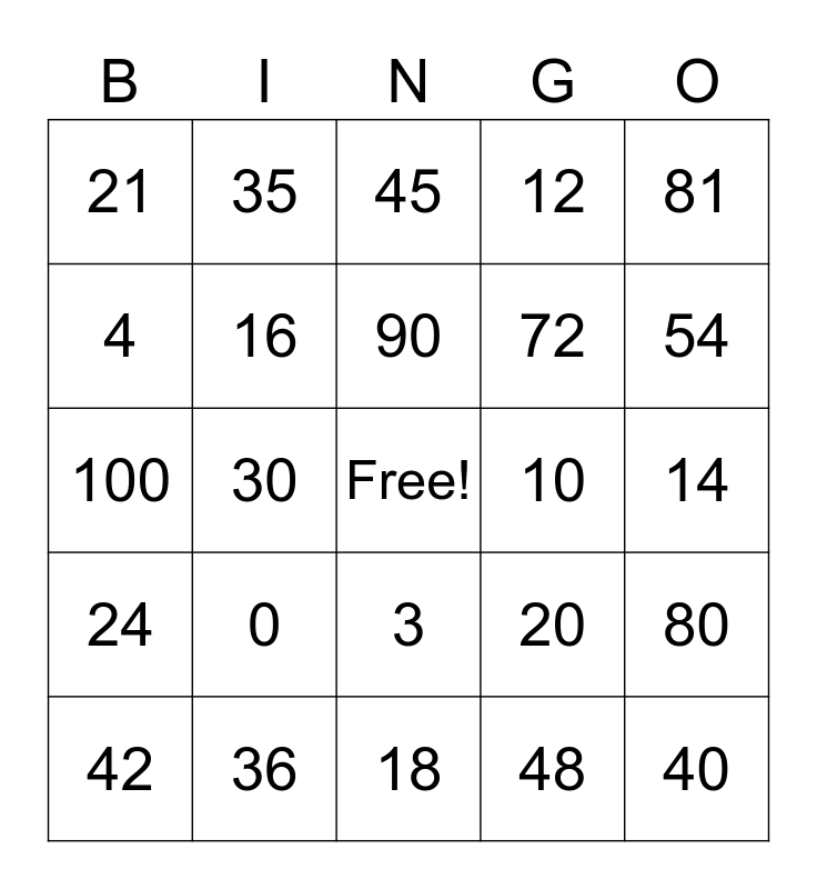 This bingo card has a free space and 29 words: 42, 64, 30, 8, 21, 45, 16, 0, 10, 36, 14, 40, 18, 48, 54, 70, 3, 24, 81, 100, 20, 9, 72, 4, 12, 35, 80, 90 and 7.