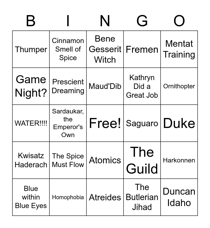 This bingo card has a free space and 33 words: Arrakis, Desert Planet, Wormsign!, Sardaukar, the Emperor's Own, Oscar Isaac, Kwisatz Haderach, Prescient Dreaming, Mentat Training, Blue within Blue Eyes, Cinnamon Smell of Spice, Eugenics, Maud'Dib, Bene Gesserit Witch, Crysknife, Caladan, Saguaro, Ornithopter, Homophobia, WATER!!!!, The Spice Must Flow, The Guild, Atomics, Sietch, Thumper, Duke, Atreides, Duncan Idaho, Fremen, Kathryn Did a Great Job, Game Night?, Harkonnen, Hunter Seeker, The Butlerian Jihad and Orange Catholic Bible.